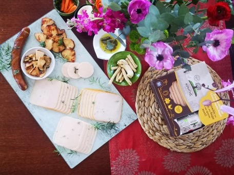 Μη ξεχάσετε να πάρετε και το απάκι κοτόπουλου όπως επίσης και το λουκάνικο κοτόπουλο γεμιστό με γραβιέρα, έτσι ώστε να δώσετε μία ζεστή νότα στο πλατό αλλαντικών σας.