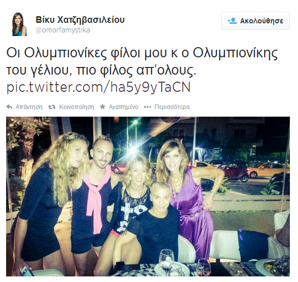 Ωστόσο, χθες το βράδυ η Βίκυ Χατζηβασιλείου ανέβασε στον λογαριασμό της στο twitter μία φωτογραφία στην οποία πόζαρε, όπως έγραψε, με τους “Ολυμπιονίκες φίλους της και τον Ολυμπιονίκη του γέλιου”, Τάκη Ζαχαράτο.