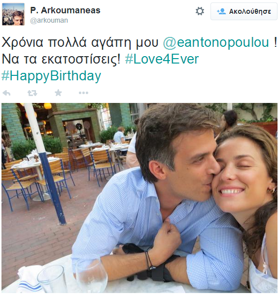 Τα γενέθλιά της έχει σήμερα η Εύα Αντωνοπούλου και ο σύζυγός της, Παναγιώτης Αρκουμανέας, θέλησε να της ευχηθεί “Χρόνια πολλά” με τον πιο τρυφερό τρόπο, ανεβάζοντας μία φωτογραφία τους στο twitter.