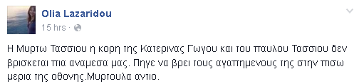 Με ένα πολύ συγκινητικό μήνυμα αποχαιρέτησε η Όλια Λαζαρίδου την κόρη της Κατερίνας Γώγου, Μυρτώ Τάσσιου, η οποία “έφυγε” ξαφνικά από τη ζωή σε ηλικία 48 ετών.