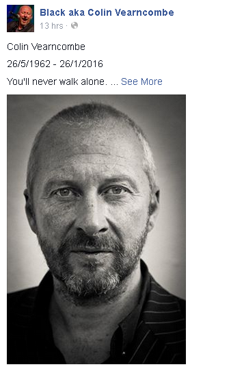 Πέθανε ο τραγουδιστής Colin Vearncombe, γνωστός ως Black, μετά από αυτοκινητιστικό ατύχημα στην Ιρλανδία που τον είχε τραυματίσει και αφήσει σε κώμα τις τελευταίες δέκα ημέρες.