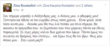 Σαν σήμερα γιόρταζε ο Αλέξανδρος μας, ο Αλέκος μου, ο αδερφός μου! Ξύπνησα και ήθελα να του ευχηθώ όπως τόσα χρόνια… Είναι ψηλά, αλλά τόσο κοντά μου… Αλεκάκι μου θα πιω ένα ποτάκι για σένα σήμερα, θα ακούσω τα τραγούδια σου, το ζεϊμπέκικο σου που χόρευες πάντα και έδινες παραγγελιά. Σε λίγες μέρες κλείνει δυο χρόνια που έφυγε. Πάντα όμως τον συναντώ σε δρόμους που επιλέγω… και ξέρω πως θα τον βρω. Φως μου, Αλέκο μου… Στην υγειά μας!!!