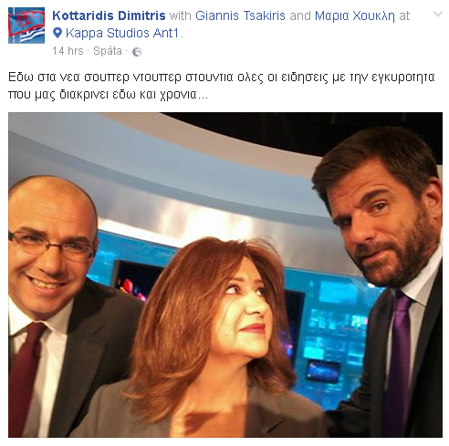 Μία φωτογραφία με την παρουσιάστρια ειδήσεων του σταθμού Μαρία Χούκλη και τον πολιτικό συντάκτη Γιάννη Τσακίρη ανέβασε ο δημοσιογράφος του ΑΝΤ1, Δημήτρης Κοτταρίδης, στη σελίδα του στο facebook.