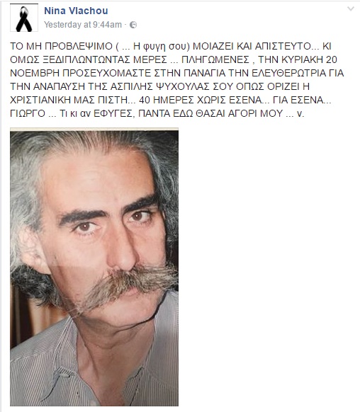 Η ίδια ανέβασε χθες ένα σπαρακτικό μήνυμα στη σελίδα της στο facebook, με αφορμή το μνημόσυνό του, που θα γίνει αυτή την Κυριακή, αναφέροντας, μεταξύ άλλων, «40 μέρες χωρίς εσένα… Για εσένα… Γιώργο… Τι κι αν έφυγες, πάντα εδώ θα ‘σαι αγόρι μου…».