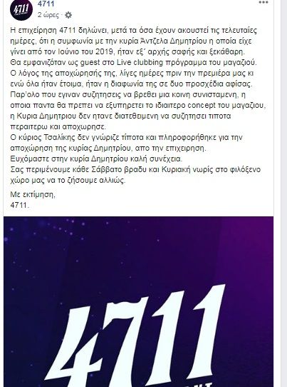 “Η επιχείρηση 4711 δηλώνει, μετά τα όσα έχουν ακουστεί τις τελευταίες ημέρες, ότι η συμφωνία με την κυρία Άντζελα Δημητρίου η οποία είχε γίνει από τον Ιούνιο του 2019, ήταν εξ΄ αρχής σαφής και ξεκάθαρη. Θα εμφανιζόταν ως guest στο Live clubbing πρόγραμμα του μαγαζιού. Ο λόγος της αποχώρησής της, λίγες ημέρες πριν την πρεμιέρα μας κι ενώ όλα ήταν έτοιμα, ήταν η διαφωνία της σε δυο προσχέδια αφίσας. Παρ’ολο που έγιναν συζητήσεις να βρεθεί μια κοινή συνισταμένη, η οποία πάντα θα πρέπει να εξυπηρετεί το ιδιαίτερο concept του μαγαζιού, η Κυρία Δημητρίου δεν ήτανε διατεθειμένη να συζητήσει τίποτα περαιτέρω και αποχώρησε. Ο κύριος Τσαλίκης δεν γνώριζε τίποτα και πληροφορήθηκε για την αποχώρηση της κυρίας Δημητρίου, από την επιχείρηση. Ευχόμαστε στην κυρία Δημητρίου καλή συνέχεια. Σας περιμένουμε κάθε Σάββατο βράδυ και Κυριακή νωρίς στο φιλόξενο χώρο μας να το ζήσουμε αλλιώς. Με εκτίμηση, 4711».