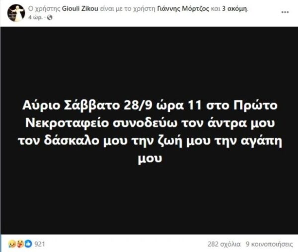 Στην ανάρτησή της αναφέρει: «Αύριο Σάββατο 28/9 ώρα 11 στο Πρώτο Νεκροταφείο συνοδεύω τον άντρα μου τον δάσκαλο μου την ζωή μου την αγάπη μου».