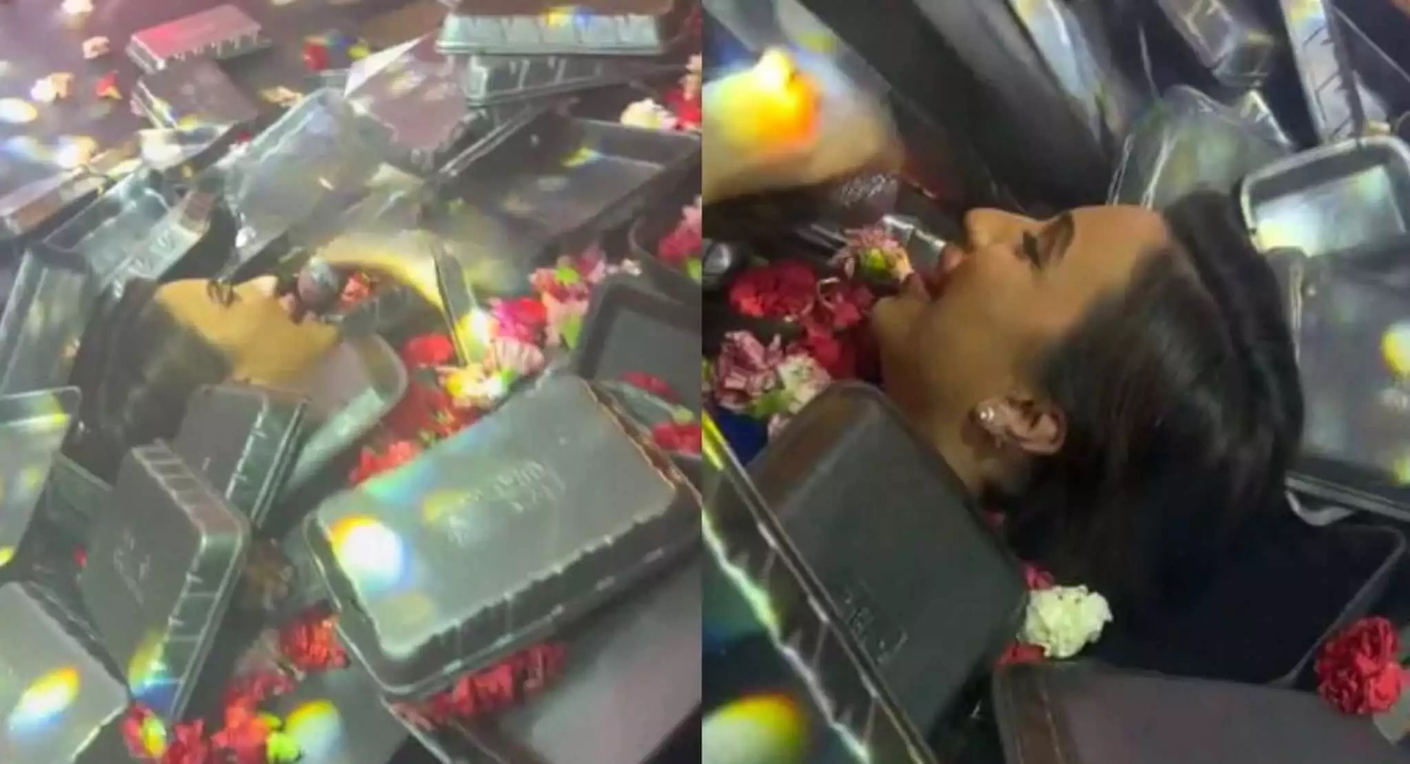 Τα πανέρια με τα λουλούδια σχημάτιζαν ένα βουνό που άρχισε να καλύπτει την Κρυσταλλία. Η ίδια με το χαμόγελο στα χείλη έκανε προσπάθεια να συνεχίσει. Στο βίντεο που ανέβηκε στο TikTok διακρίνεται μόνο το κεφάλι της. Το υπόλοιπο σώμα έχει καλυφθεί από τα λουλούδια, με τον κόσμο να διασκεδάζει και ορισμένους να ανοίγουν τα κινητά τους τηλέφωνα για να απαθανατίσουν τις σκηνές.