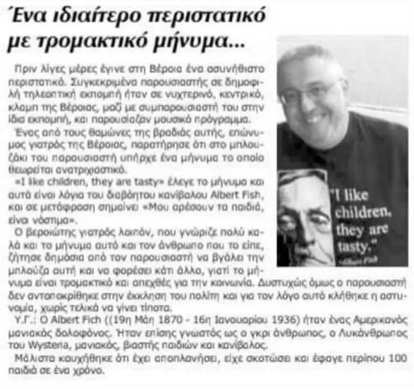 Ένας από τους θαμώνες της βραδιάς αυτής, επώνυμος γιατρός της Βέροιας, παρατήρησε ότι στο μπλουζάκι του παρουσιαστή υπήρχε ένα μήνυμα το οποίο θεωρείται ανατριχιαστικό. «I like children, they are tasty» έλεγε το μήνυμα και αυτά είναι λόγια του διαβόητου κανίβαλου Albert Fish, και σε μετάφραση σημαίνει «Μου αρέσουν τα παιδιά, είναι νόστιμα».