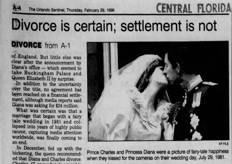Το διαζύγιο έριξε αυλαία στο παραμύθι που ξεκίνησε στις 29 Ιουλίου του 1981, την ημέρα που περισσότεροι από 750 εκατομμύρια άνθρωποι συντονίστηκαν τηλεοπτικά για να παρακολουθήσουν τον γάμο του πρίγκιπα Καρόλου και της νεαρής Λαίδης Νταϊάνα Σπένσερ.