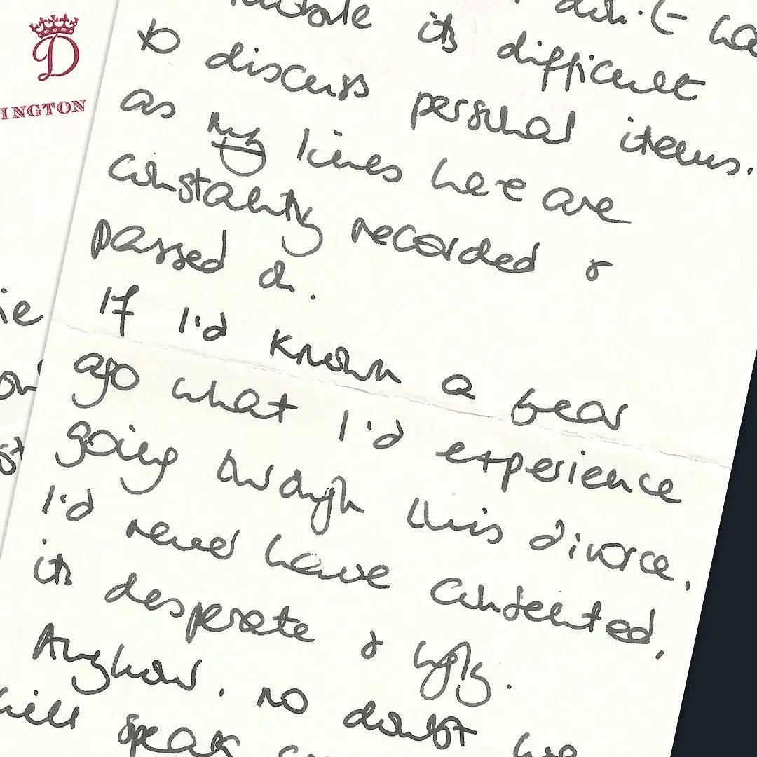 «Αν ήξερα πριν από ένα χρόνο τι θα ζούσα μέσα από αυτό το διαζύγιο, ποτέ δεν θα συναινούσα. Είναι άσχημο», γράφει σε ένα από τα χειρόγραφα σημειώματά της η πριγκίπισσα.