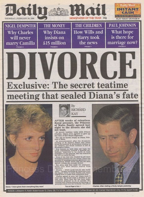 Το διαζύγιο ολοκληρώθηκε στις 28 Αυγούστου 1996, με τη Νταϊάνα να διατηρεί τον τίτλο της Πριγκίπισσας της Ουαλίας φεύγοντας από ένα γάμο με 15 εκατ. λίρες.