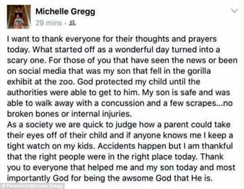 «Για όσους από εσάς δεν έχετε δει ειδήσεις ή κάποιο βίντεο στα social media, αυτό το παιδί που έπεσε μέσα στο κλουβί του γορίλα ήταν ο γιος μου. Ο Θεός το προστάτευσε μέχρι να αναλάβει δράση η διεύθυνση του ζωολογικού κήπου. Ο γιος μου είναι καλά στην υγεία του και ξεπέρασε αυτή τη δοκιμασία με μια απλή διάσειση, λίγες γρατζουνιές, χωρίς σπασμένα κόκκαλα, χωρίς εσωτερική αιμορραγία.