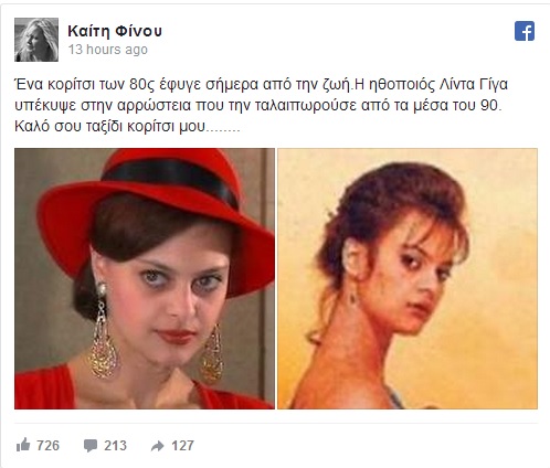 Ένα κορίτσι των 80s έφυγε σήμερα από την ζωή. Η ηθοποιός Λίντα Γίγα υπέκυψε στην αρρώστια που την ταλαιπωρούσε από τα μέσα του ’90. Καλό σου ταξίδι κορίτσι μου