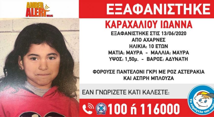 Πρόκειται για την 10χρονη Ιωάννα Καραχάλιου τα ίχνη της οποίας χάθηκαν το απόγευμα του Σαββάτου (13.06.2020) από τις Αχαρνές.