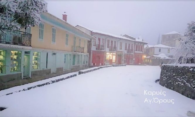 Η «Ελπίδα», η κακοκαιρία που σφυροκοπά τη χώρα και σύμφωνα με τις εκτιμήσεις θα δείξει τις πιο άγριες διαθέσεις της, τις επόμενες ώρες έντυσε τα λευκά και το Περιβόλι της Παναγίας, το Άγιο Όρος.