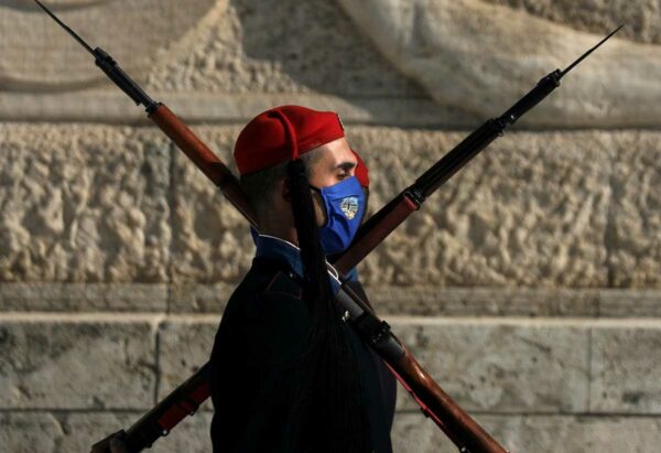 Η λεπτομέρεια αυτή είναι ότι και οι εύζωνες δεν έχουν μείνει ανεπηρέαστοι από τον κορονοϊό. Και οι εύζωνες φορούν μάσκα για να προστατευθούν από την πανδημία.