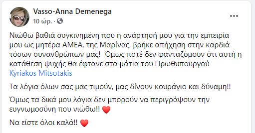 Η αντίδραση του πρωθυπουργού προκάλεσε έκπληξη και συγκίνηση στη μητέρα της Μαρίνας η οποία δεν περίμενε ποτέ πως η κατάθεση ψυχής της θα έφτανε μέχρι τον Κυριάκο Μητσοτάκη. «Νιώθω βαθιά συγκινημένη που η ανάρτησή μου για την εμπειρία μου ως μητέρα ΑΜΕΑ, της Μαρίνας, βρήκε απήχηση στην καρδιά τόσων συνανθρώπων μας!», έγραψε και συμπλήρωσε πως «τα λόγια όλων σας μας τιμούν, μας δίνουν κουράγιο και δύναμη!! Όμως τα δικά μου λόγια δεν μπορούν να περιγράψουν την ευγνωμοσύνη που νιώθω!! Να είστε όλοι καλά!!».