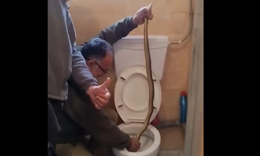 Η επιχείρηση διάσωσης φιδιού άνω του ενός μέτρου καταγράφηκε σε βίντεο - Το ερπετό ζούσε τρώγοντας τρωκτικά εντός του αποχετευτικού συστήματος ενώ επισκεπτόταν τη λεκάνη για να πίνει νερό