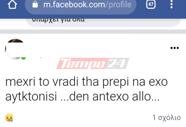 «Μέχρι το βράδυ θα πρέπει να έχω αυτοκτονήσει, δεν αντέχω άλλο», ήταν το μήνυμα που ανήρτησε στον προσωπικό του λογαριασμό στο facebook, γνωστός Αχαιός, πρώην παρουσιαστής πανελλαδικού τηλεοπτικού σταθμού.