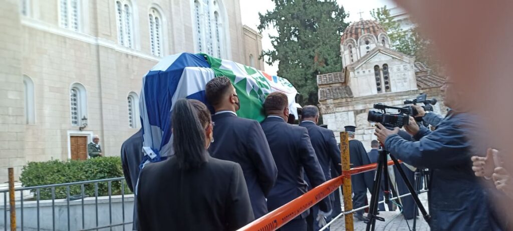 To φέρετρο της Ελληνίδας πολιτικού σκεπασμένο με την ελληνική σημαία, τη σημαία του ΠΑΣΟΚ και τη σημαία του Κινήματος Αλλαγής έφτασε λίγο μετά τις 8 στο πρωί στο παρεκκλήσι της Μητρόπολης Αθηνών, ενώ στις 2 μετά το μεσημέρι θα μεταφερθεί στον μητροπολιτικό ναό προκειμένου να ψαλεί η εξόδιος ακολουθία.