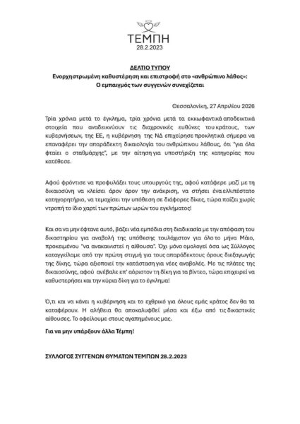 Σκληρή ανακοίνωση από το Σύλλογο Συγγενών Θυμάτων των Τεμπών: Η αλήθεια θα αποκαλυφθεί…