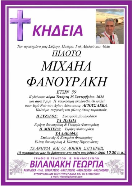 Η εξόδιος ακολουθία θα ψαλεί στις 3 το μεσημέριΤο τελευταίο αντίο θα πουν σήμερα συγγενείς και φίλοι στον άτυχο 59χρονο Μιχάλη Φανουράκη που έχασε την ζωή του στην άσφαλτο.
