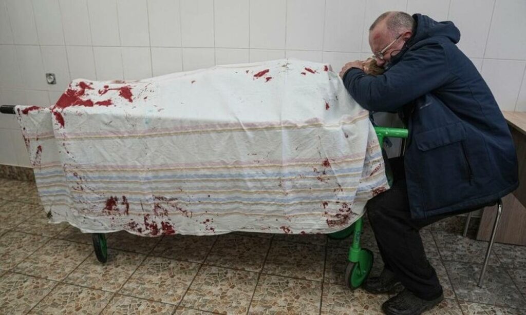 Οι συγκλονιστικές εικόνες καταγράφηκαν στο νοσοκομείο της Μαριούπολης με τον Σεργκέι, όπως είναι το όνομα του πατέρα, να βρίσκεται δίπλα στο καλυμμένο με ένα λευκό σεντόνι γεμάτο αίματα άψυχο κορμί του 15χρονου Ίλια.