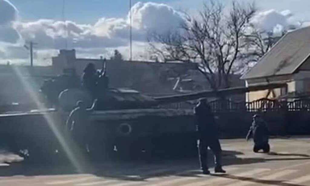 Η επόμενη κίνηση του Ουκρανού πολίτη ήταν να γονατίσει μπροστά από το άρμα ελπίζοντας ότι οι Ρώσοι στρατιώτες δεν θα προχωρήσουν προς τα εμπρός.