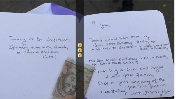 Ανοίγοντας τον φάκελο, η Tammi έμεινε έκπληκτη όταν βρήκε μέσα ένα χαρτονόμισμα των 10 λιρών μαζί με ένα χειρόγραφο σημείωμα. Η κάρτα ανέφερε ότι η άγνωστη, που υπέγραψε την κάρτα ως «η μαμά του Jason», ήθελε να κάνει μια χειρονομία καλής θέλησης για τα 28α γενέθλια του γιου της.