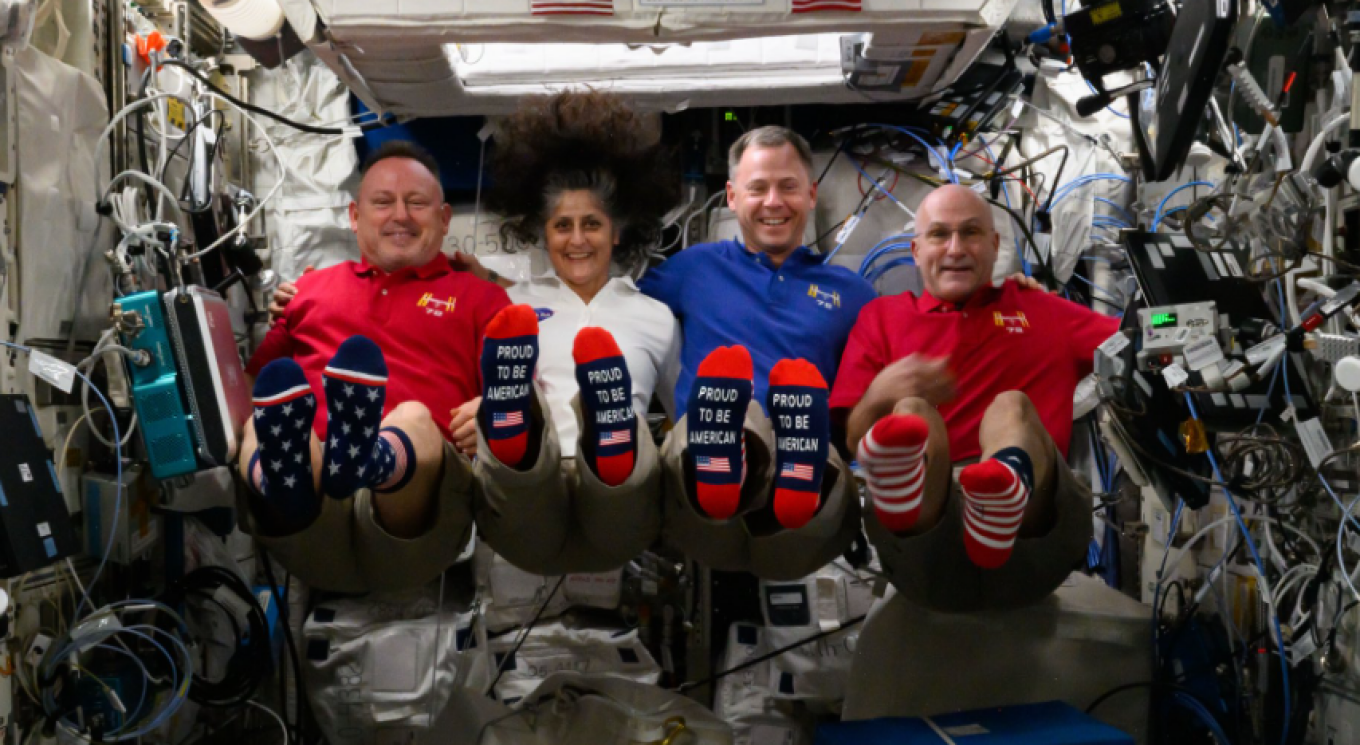 Σύμφωνα με δημοσίευμα του protothema.gr, οι αστροναύτες της NASA που βρίσκονται στον Διεθνή Διαστημικό Σταθμό κοινοποίησαν φωτογραφία που τους δείχνει να είναι στον αέρα και να επιδεικνύουν κάλτσες που έχουν τα χρώματα της αμερικανικής σημαίας.