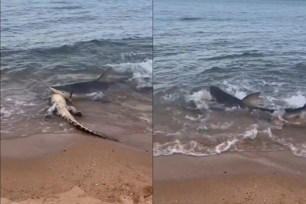 Απίστευτο σκηνικό εκτυλίχθηκε σε παραλία της Αυστραλίας μπροστά στα μάτια των λουόμενων. Καρχαρίας καταβροχθίζει κροκόδειλο στα ρηχά!