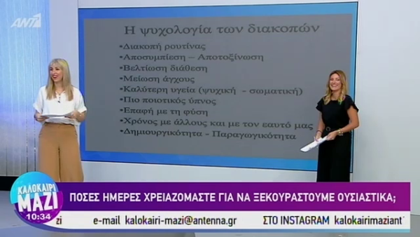 Επιστημονικές έρευνες για τις διακοπές υποστηρίζουν ότι οι θετικές επιπτώσεις στην ευεξία κορυφώνονται την όγδοη ημέρα της άδειας και εξαφανίζονται μετά από μια εβδομάδα επιστροφής στη δουλειά.
