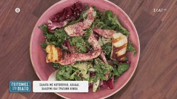 Σαλάτα με κοτόπουλο, αχλάδι, χαλούμι και τραγανή κινόα από τον Δημήτρη Σκαρμούτσο