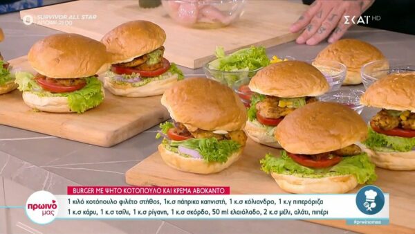 Ο Δημήτρης Σκαρμούτσος μάς ετοιμάζει μπέργκερ με ψητό κοτόπουλο και και κρέμα αβοκάντο!