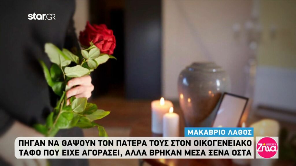 Σύμφωνα με το ρεπορτάζ που παρουσίασε σήμερα η εκπομπή “Αλήθειες με τη Ζήνα”πήγαν να θάψουν τον πατέρα τους στον οικογενειακό τάφο που είχε αγοράσει ο ίδιος και πλήρωνε επί 15 χρόνια, αλλά βρήκαν μέσα ξένα οστά και ένα πολυτελές μνήμα.