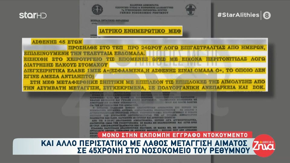 Μετά τη σοκαριστική υπόθεση της λάθος μετάγγισης στο Τζάνειο, ένα νέο περιστατικό αποκαλύπτεται αυτή τη φορά στην Κρήτη. Μια 45χρονη γυναίκα παραλίγο να χάσει τη ζωή της οταν της έβαλαν λάθος ομάδα αίματος κατά τη διάρκεια χειρουργικής επέμβασης τον περασμένο Οκτώβριο στο νοσοκομείο του Ρεθύμνου.