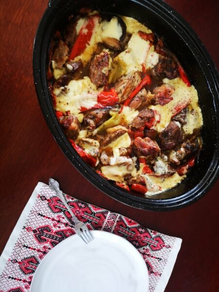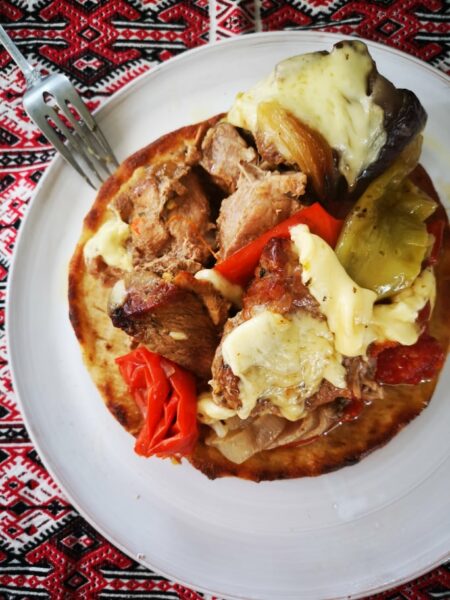 Ζητάμε από τον κρεοπώλη μας να μας κόψει το κρέας σε χοντρά κομμάτια 5-6 εκατοστών περίπου. Το μπουτάκι το ζητάμε με το κόκκαλο και αυτό σε μερίδες. Σε μία λεκάνη βάζουμε όλα τα κομμάτια κρέατος και ρίχνουμε το κρασί, τη ρίγανη το αλατοπίπερο και το ελαιόλαδο. Κόβουμε τις πιπεριές μας κάθετα και τις χωρίζουμε σε 4 κομμάτια μεγάλα, τα κρεμμύδια και τις ντομάτες ροδέλες και τις σκελίδες σκόρδου ολόκληρες. Τα ρίχνουμε και αυτά μέσα στη λεκάνη και ανακατεύουμε. Στη συνέχεια παίρνουμε ένα κομμάτι κρέας και ένα λαχανικό εναλλάξ και τα τοποθετούμε κυκλικά στη γάστρα μας. Ρίχνουμε μέσα και το ζωμό από την λεκάνη, σκεπάζουμε και ψήνουμε στους 200 με αέρα για 2 δύομιση με τρείς ώρες. Στο τελευταίο 15 λεπτο ξεσκεπάζουμε και κόβουμε σε μεγάλα κομμάτια το τυρί μας που το βάζουμε να λιώσει με ανοιχτό καπάκι. Σερβίρουμε με πίτες για σουβλάκι και πατάτες τηγανητές.