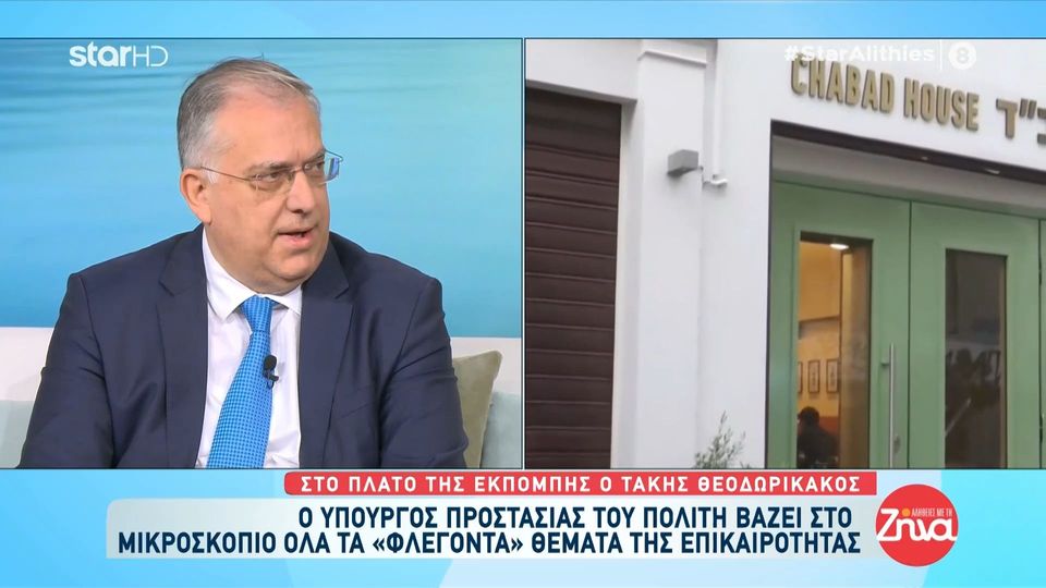 Στο πλατό της εκπομπής “Aλήθειες με τη Ζήνα’ βρέθηκε το μεσημέρι της Τετάρτης, ο Τάκης Θεοδωρικάκος. Ο υπουργός Προστασίας του Πολίτη βάζει στο μικροσκόπιο όλα τα «φλέγοντα» θέματα της επικαιρότητας.