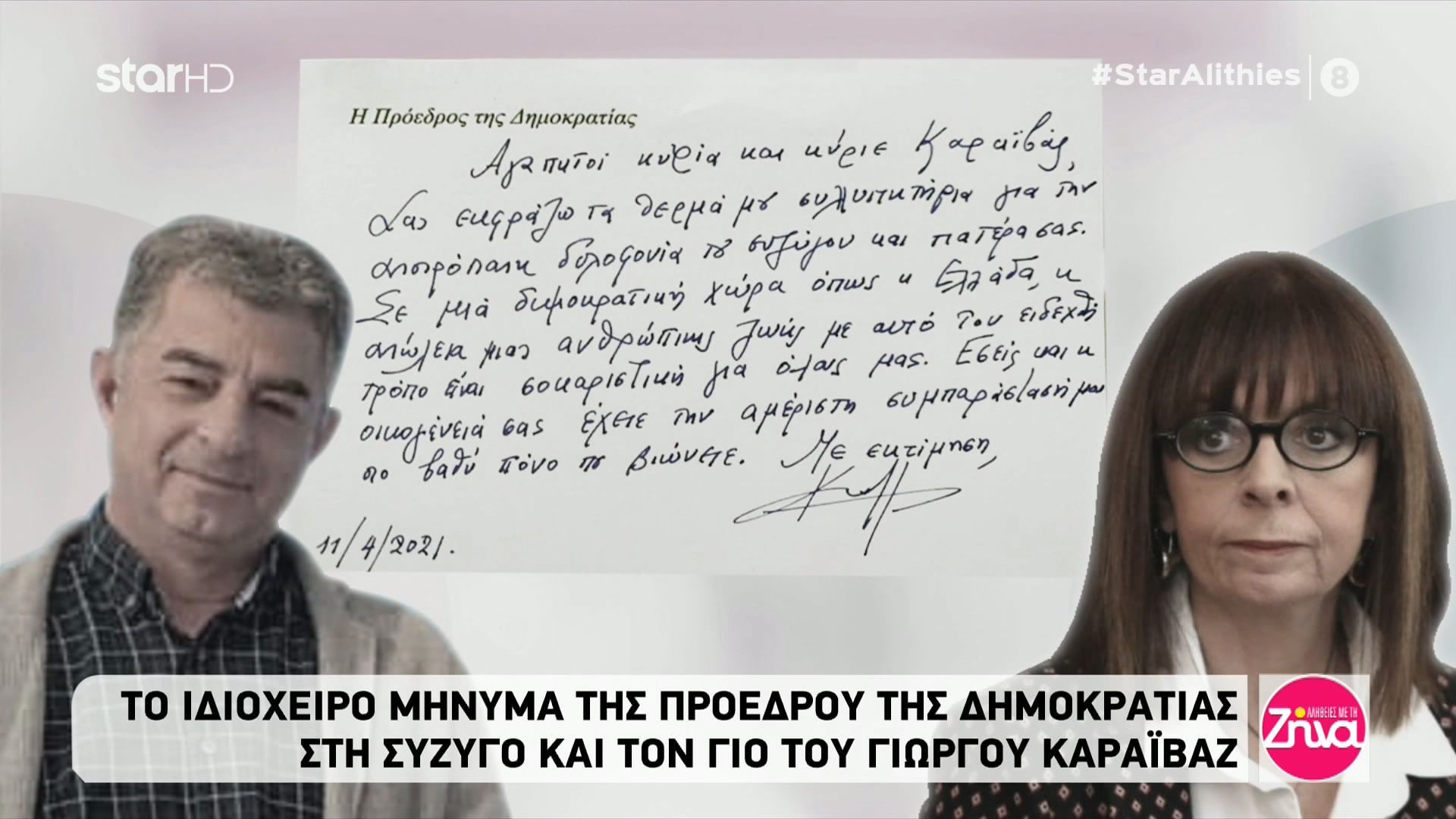 Ιδιόχειρο σημείωμα έστειλε η Προέδρος της Δημοκρατίας στη σύζυγο και τον γιο του Γιώργου Καραϊβάζ-Όσα τους γράφει