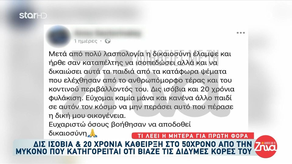 Καταδικάσθηκε 50χρονος στη Μύκονο που βίαζε τα ανήλικα δίδυμα κορίτσια του-Συγκλονίζει η μητέρα των παιδιών: Εύχομαι να μην το περάσει καμία μάνα αυτό…