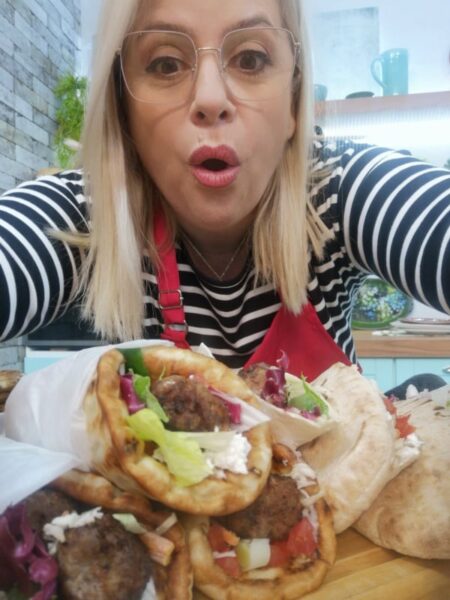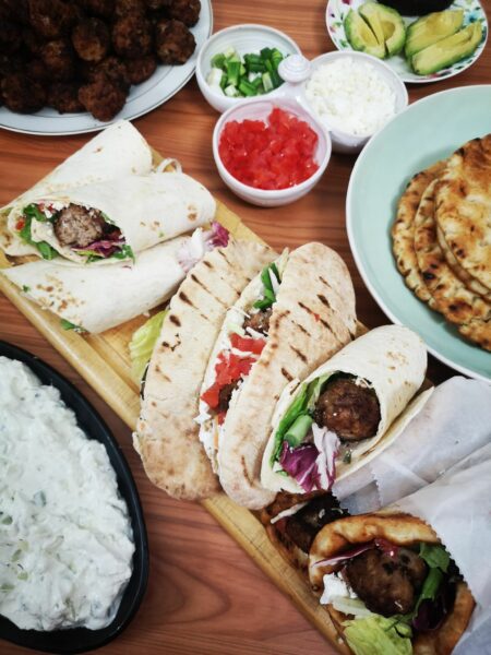Βάζουμε όλα τα υλικά μαζί και τα πλάθουμε μαζί με τον κιμά. Στην συνέχεια πλάθουμε κεφτέδες τους ρολάρουμε με αλεύρι και τηγανίζουμε σε ελαιόλαδο. Σε μία μπασίνα ανακατεύουμε όλα τα υλικά για το σουβλάκι τα οποία είναι κομμένα σε μικρά καρεδάκια. Τους βάζουμε ξύδι-λάδι, αλάτι-πιπέρι και θρυματίζουμε στο μείγμα φέτα. Ανακατεύουμε όλα τα υλικά μαζί ανοίγουμε μία πίτα βάζουμε μείγμα λαχανικών και 3 κεφτεδάκια. Κλείνουμε σε σουβλάκι με ένα κομμάτι λαδόκολλα.