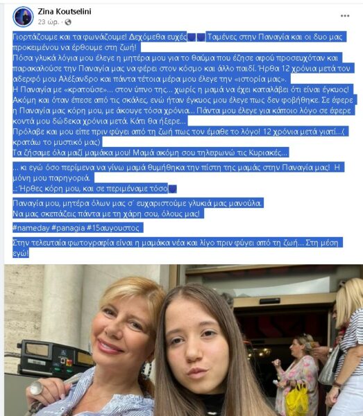 Ένα άκρως συγκινητικό μήνυμα για το θαύμα της Παναγιάς που έζησε η μητέρα της, ανήρτησε στον προσωπικό της λογαριασμό στο Facebook η παρουσιάστρια της εκπομπής “Αλήθειες με τη Ζήνα” Ζήνα Κουτσελίνη.