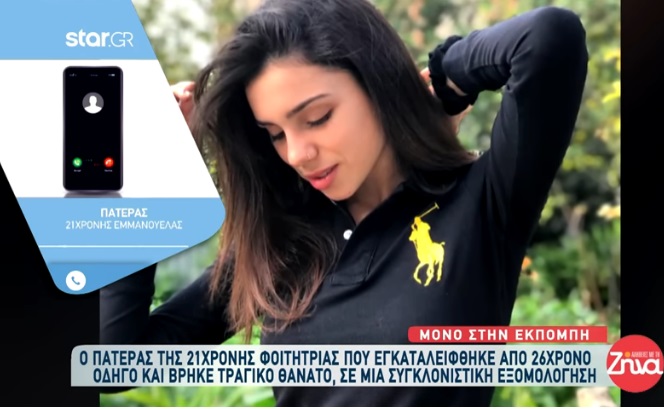 Ο πατέρας της 21χρονης φοιτήτριας που χτυπήθηκε και εγκαταλείφθηκε από 26χρονο οδηγό και την 19χρονη συνοδηγό του, έκανε μία συγκλονιστική εξομολόγηση το μεσημέρι της Τετάρτης στην εκπομπή “Αλήθειες με τη Ζήνα” και στον Στρατή Λημνιό, λίγες ώρες πριν το τελευταίο αντίο και ενώ η καρδιά και τα όργανα της Εμμας έδωσαν ζωή σε άλλους συνανθρώπους μας