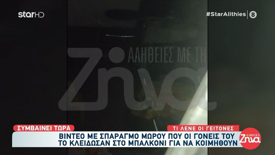 Βίντεο ντοκουμέντο από τη στιγμή που το 11μηνών βρέφος βρίσκεται μόνο του στο μπαλκόνι διαμερίσματος στο κέντρο της Θεσσαλονίκης και σπαράζει στο κλάμα, ενώ οι γονείς του κοιμούνταν ανενόχλητοι στο εσωτερικό του σπιτιού, δημοσιεύει η εκπομπή “Αλήθειες με τη Ζήνα” με τον δημοσιογράφο Στρατή Λημνιό να ξεσπά.