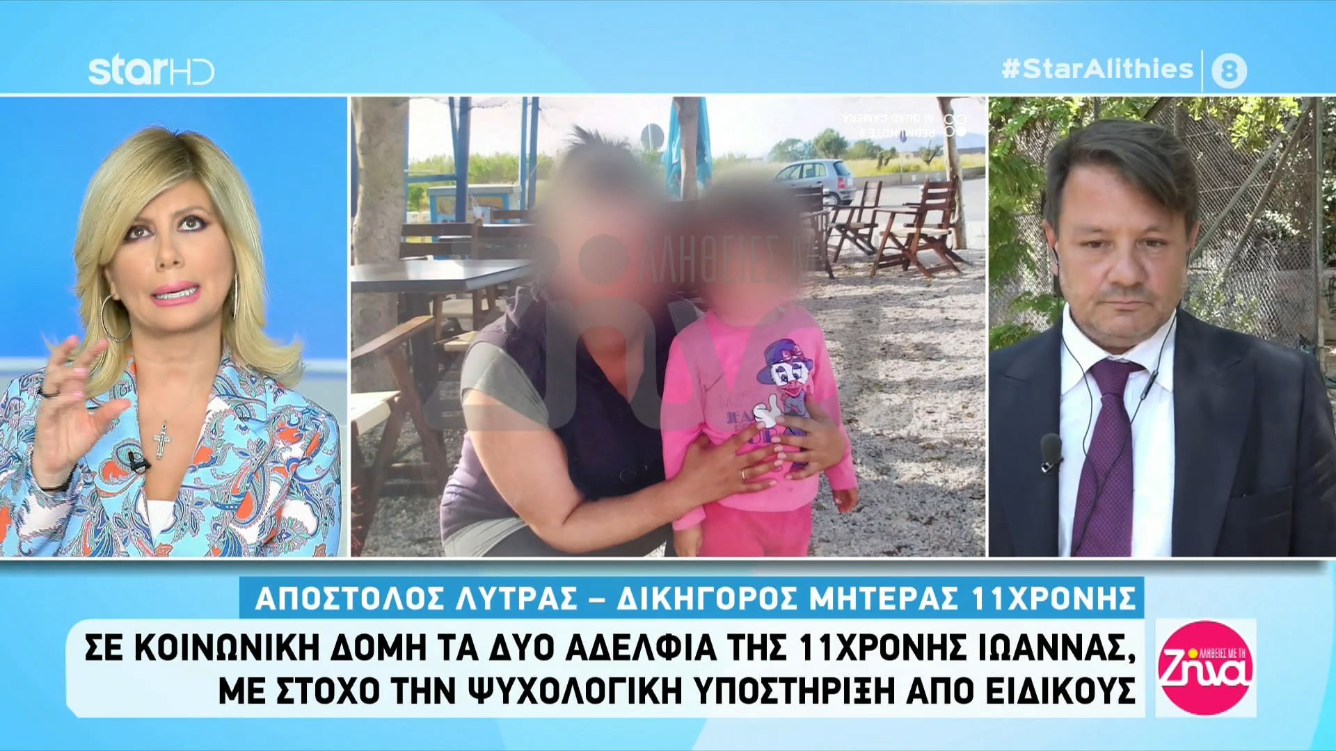 Το μεσημέρι της Παρασκευής, ο δικηγόρος της μητέρας της 11χρονης, Απόστολος Λύτρας, μίλησε στην εκπομπή” Αλήθειες με τη Ζήνα” και όπως είπε τα παιδιά φιλοξενούνται εκεί μετά από εισαγγελική παρέμβαση και παρακολουθούνται από ψυχολόγους, για να μπορέσουν να αντιμετωπίσουν την απώλεια της αδελφούλας τους.