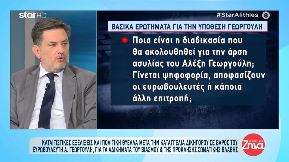 Καταιγιστικές εξελίξεις και πολιτική θύελλα μετά την καταγγελία δικηγόρου σε βάρος του ευρωβουλευτή Αλέξη Γεωργούλη, η οποία αφορά στα αδικήματα του βιασμού και της πρόκλησης σωματικής βλάβης.