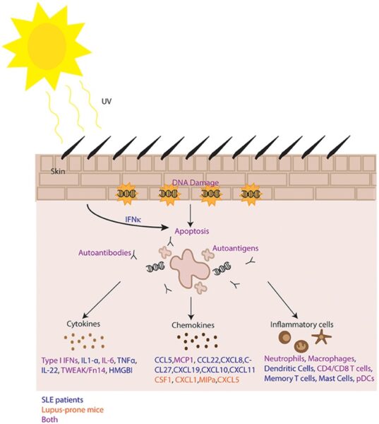 Ειδικότερα, όσον αφορά τα αυτοάνοσα νοσήματα, τα οποία εξαρτώνται σε μεγάλο βαθμό από περιβαλλοντικούς παράγοντες, η ευαισθησία στην υπεριώδη ακτινοβολία (φωτοευαισθησία) είναι ένα κοινό χαρακτηριστικό πολλών από αυτά, συμπεριλαμβανομένου του συστηματικού και δερματικού ερυθηματώδους λύκου (SLE και CLE, αντίστοιχα), της δερματομυοσίτιδας και περιστασιακά του συνδρόμου Sjögren.