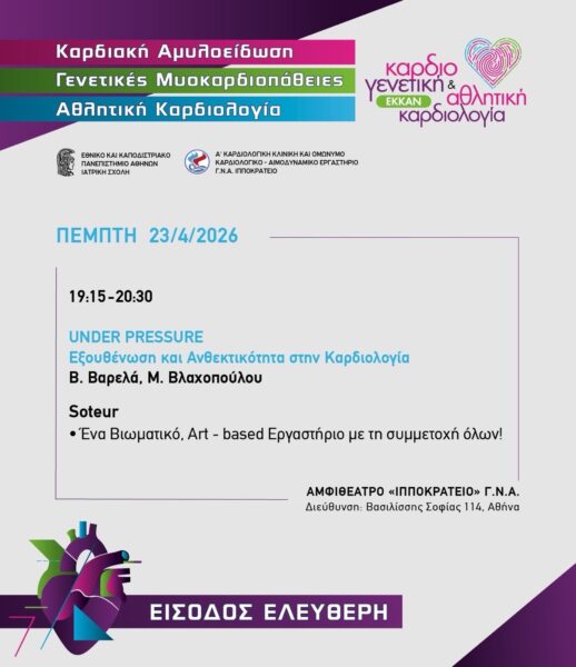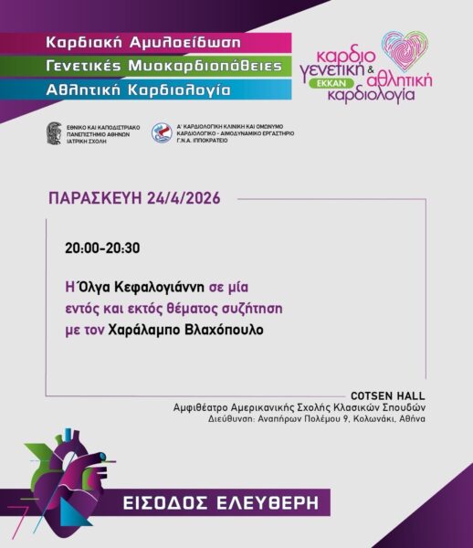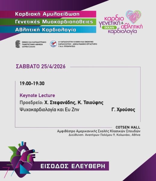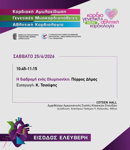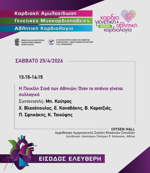 Η Αθήνα φιλοξενεί στις 23–25 Απριλίου στο «Ιπποκράτειο» Γενικό Νοσοκομείο Αθηνών και το Αμφιθέατρο της Γενναδείου Βιβλιοθήκης (CotsenHall) μια υψηλού επιπέδου διεθνή επιστημονική συνάντηση αφιερωμένη στην Καρδιακή Αμυλοείδωση, τις Γενετικές Μυοκαρδιοπάθειες και την Αθλητική Καρδιολογία,φέρνοντας στο προσκήνιο τρεις ταχέως εξελισσόμενους τομείς της σύγχρονης Καρδιολογίας με άμεσο αποτύπωμα στη δημόσια υγεία. Η συνάντηση διοργανώνεται από την Μονάδα Καρδιογενετικής& Αθλητικής Καρδιολογίας (Υπεύθυνος Καθ. Χαράλαμπος Βλαχόπουλος) της Α’ Καρδιολογικής Κλινικής του Εθνικού Καποδιστριακού Πανεπιστημίου Αθηνών, Ιπποκράτειο ΓΝΑ (Διευθυντής Καθ. Κωνσταντίνος Τσιούφης).