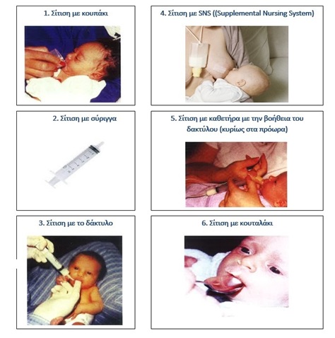 Σε περιπτώσεις ανάγκης χορήγησης μητρικού γάλακτος ή υποκατάστατου μητρικού γάλακτος μπορεί να χρησιμοποιηθούν εναλλακτικοί τρόποι σίτισης: