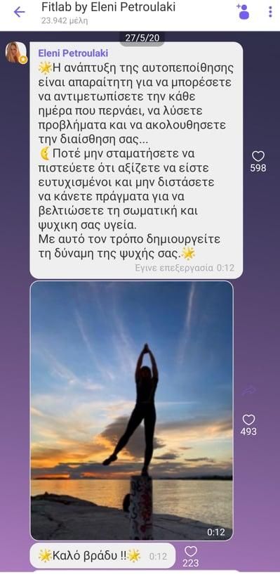 Γι αυτό έγιναν συνοδοιπόροι της σε αυτό το νέο της βήμα. Το Fitlab by Eleni Petroulaki που συνεργάζεται με τη δημοφιλή εφαρμογή και προσφέρει καθημερινά βίντεο με ασκήσεις, συμβουλές fitness, προτάσεις διατροφής ενώ η ίδια που επιμελείται τα πάντα μοιράζεται και όμορφες σκέψεις για τη ζωή γράφοντας κειμενάκια στο viber!